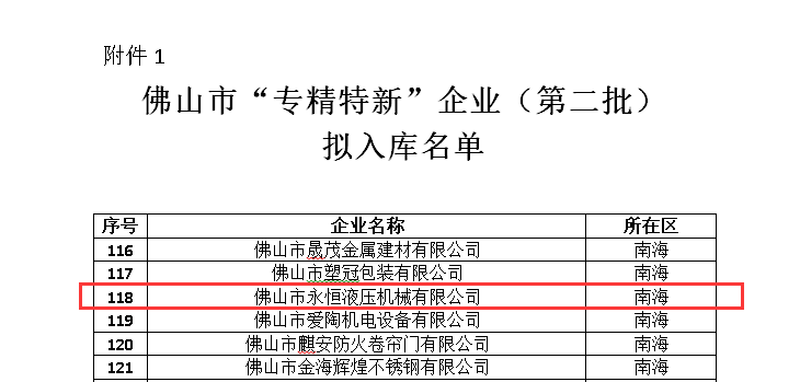 永恒液壓憑借廣闊的市場空間、產(chǎn)品用途的專門性、生產(chǎn)工藝的專業(yè)性及自主技術的專有性,成功入庫佛山市“專精特新”企業(yè)。